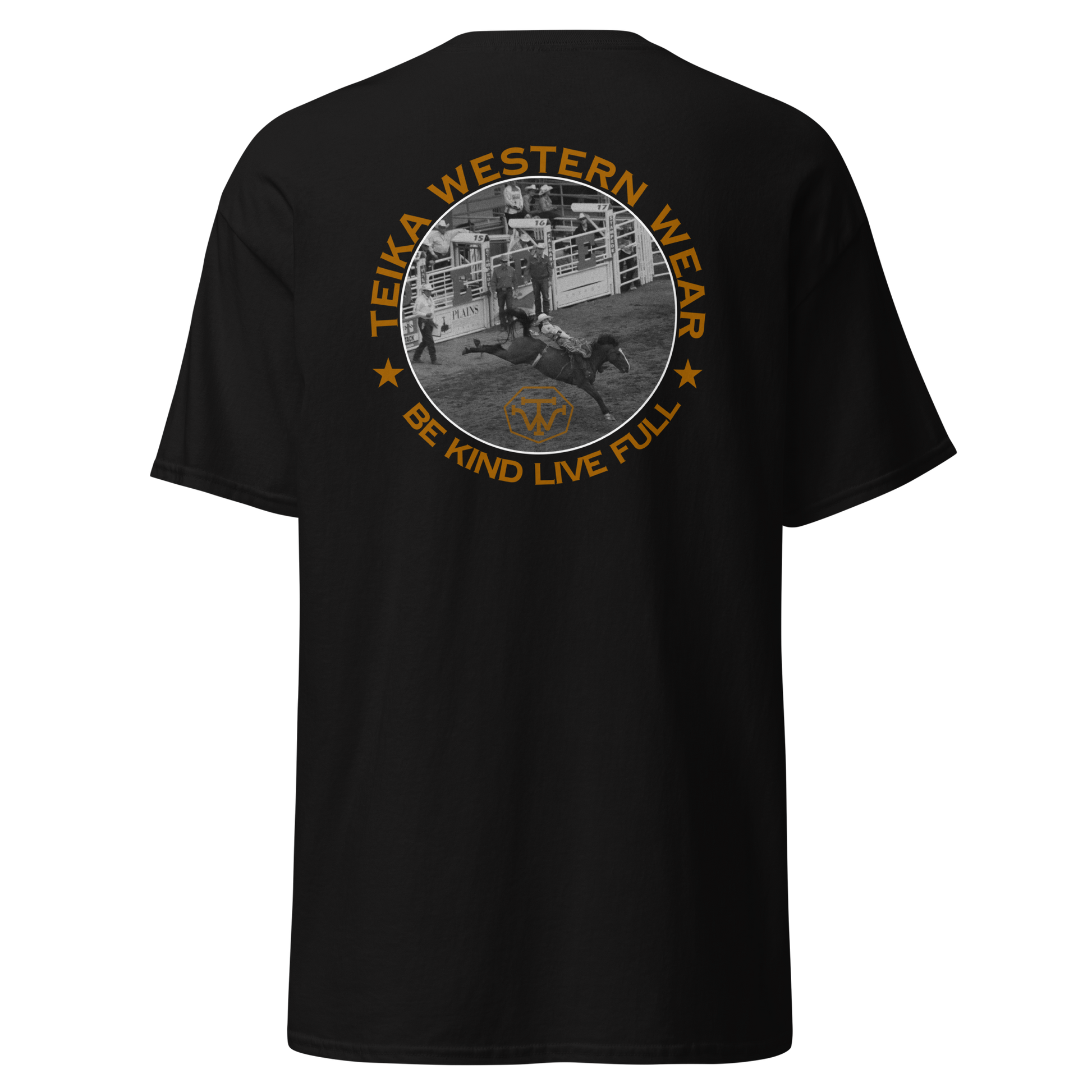 This tee captures what Teika stands for — living fully, staying kind, and holding on tight even when life bucks hard. Featuring a rodeo photo from the world famous Calgary Stampede, framed by bold Teika Western Wear lettering and our mantra “Be Kind. Live Full.”, this design celebrates both the toughness and tenderness that defines the brand.